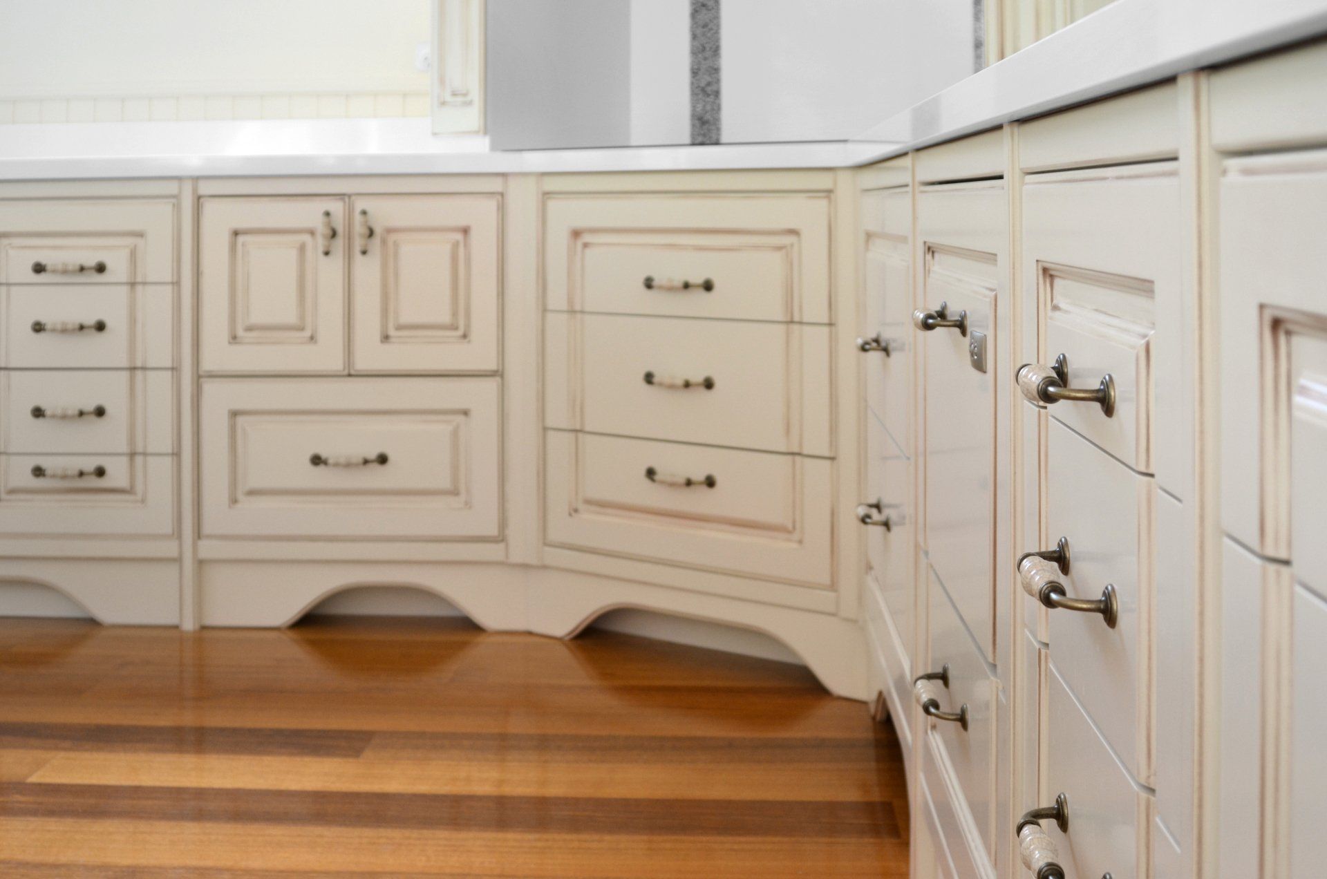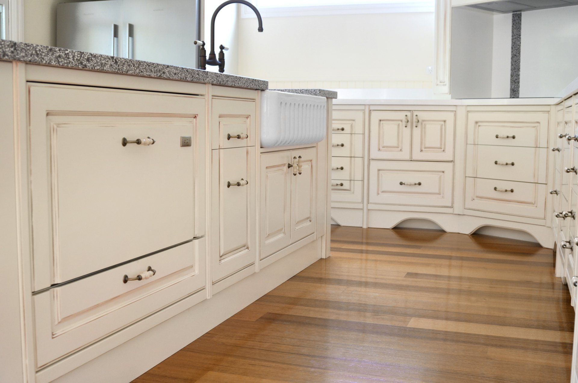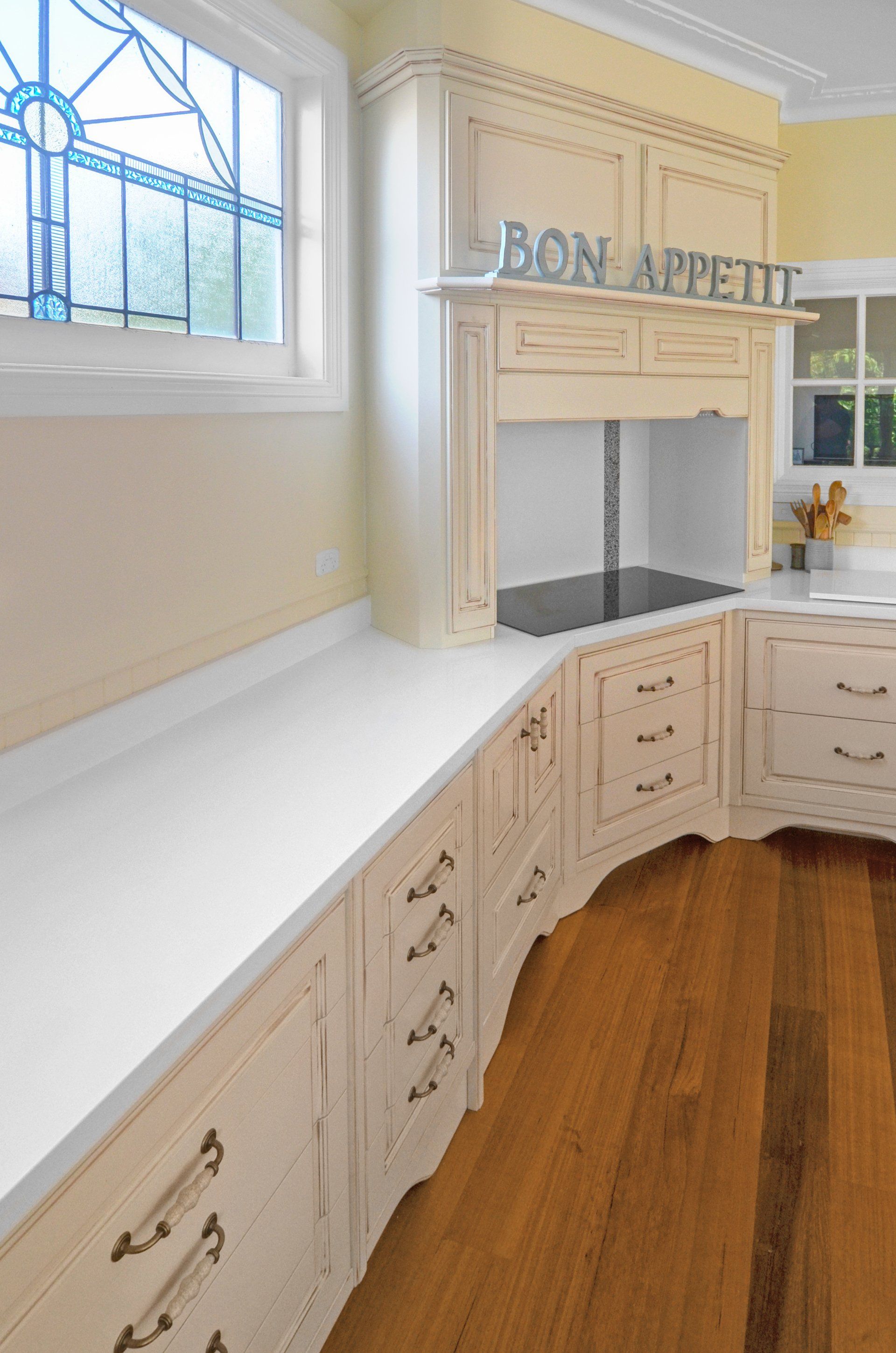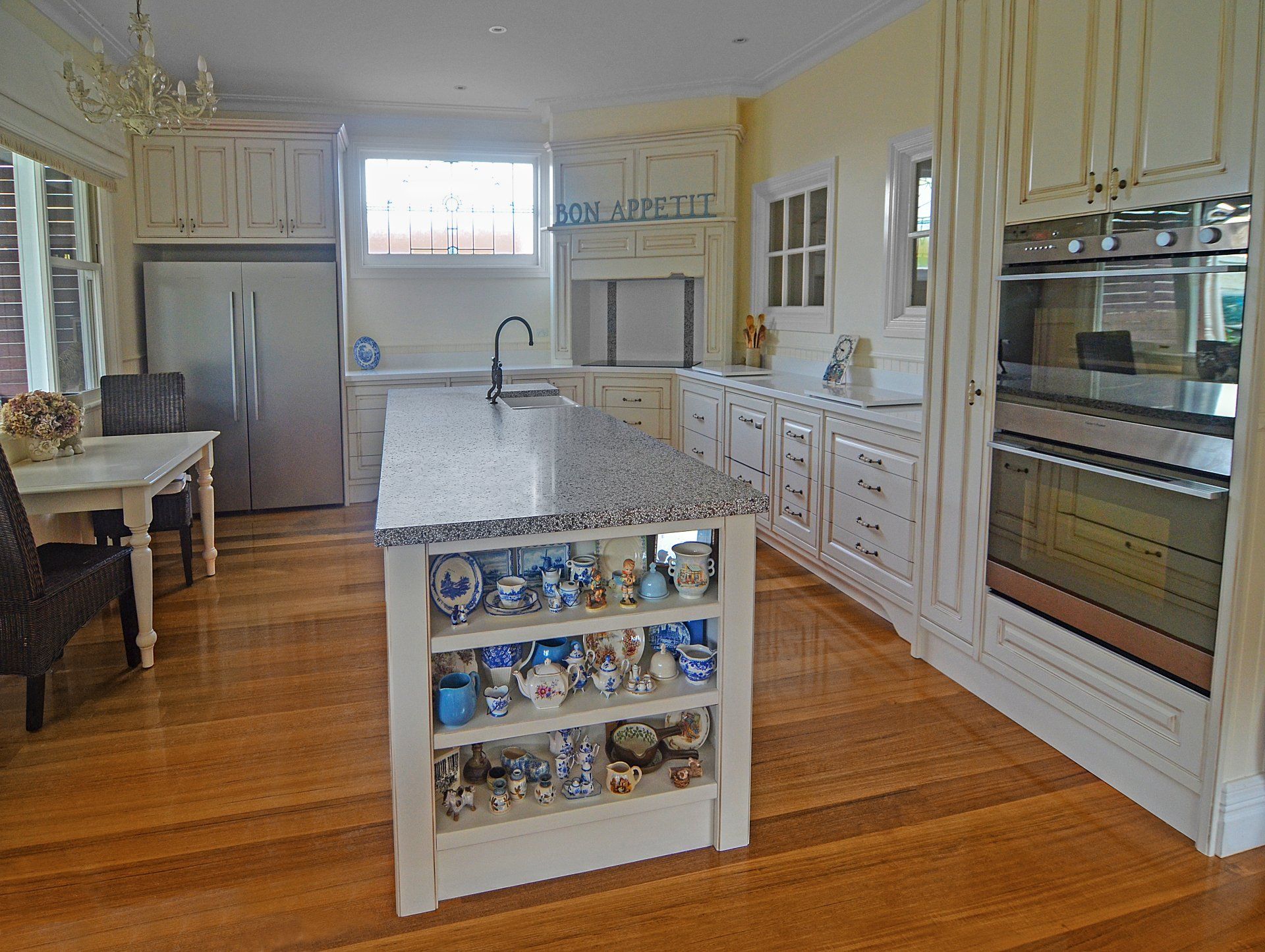 This modern provincial style kitchen is located in the seaside town of Inverloch. The functional layout is designed around existing antique stained glass, architecturally interesting windows and blends with the decorative style of the adjoining lounge and dining areas.