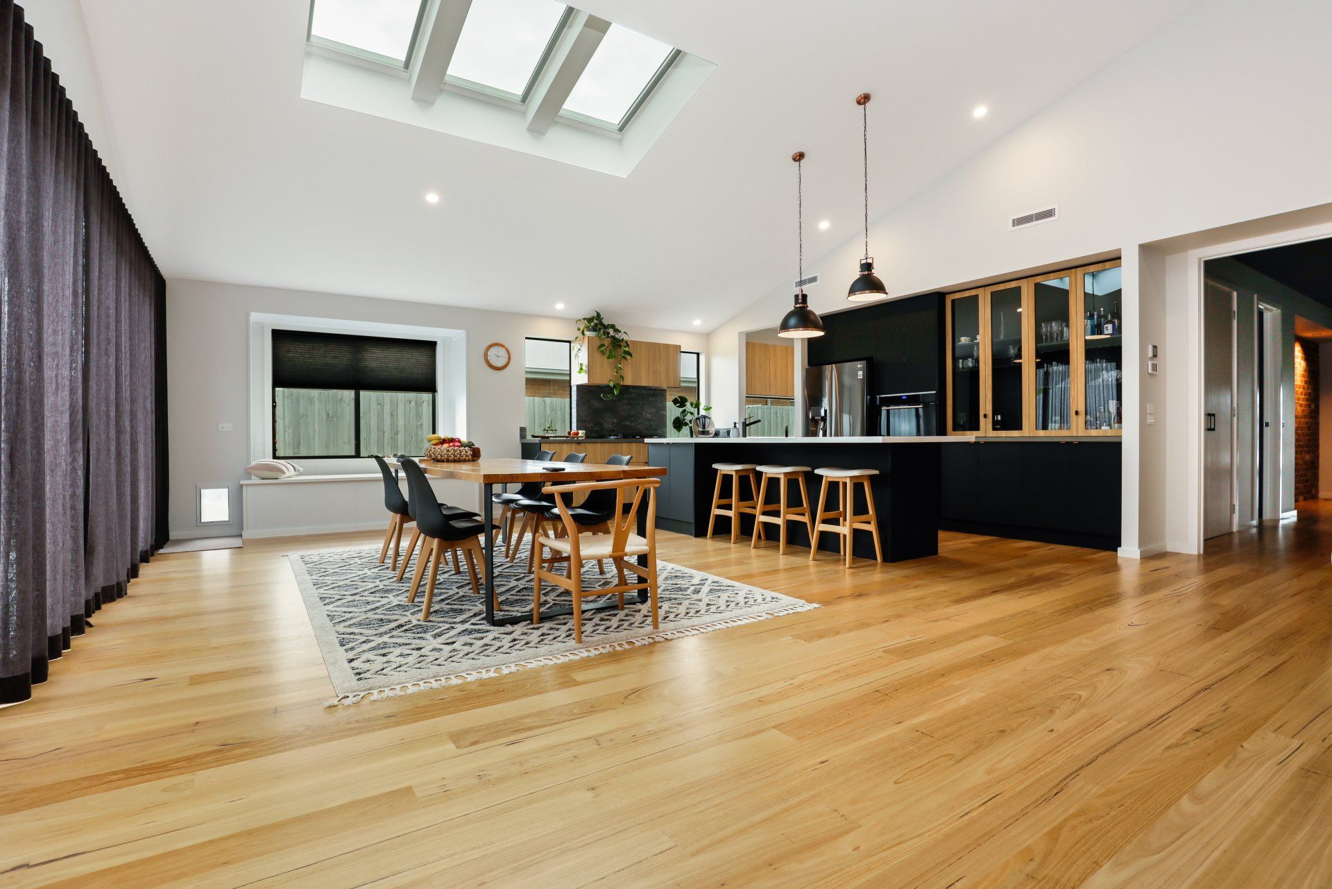 A new home, built by Hotondo Homes Inverloch, in a new subdivision of newly released land, next to Inverloch’s surf beach. As you walk through the front door, you are immediately struck by the home’s unique and high-quality finishes and design. Rustic brick feature walls, matt black fixtures and fittings draw you along the ‘Fire Streak’ solid timber floor hallway, which winds along the house’s front bedroom and living spaces towards the centre of the home into the open plan kitchen, adjoining dining, alfresco and lounge areas.