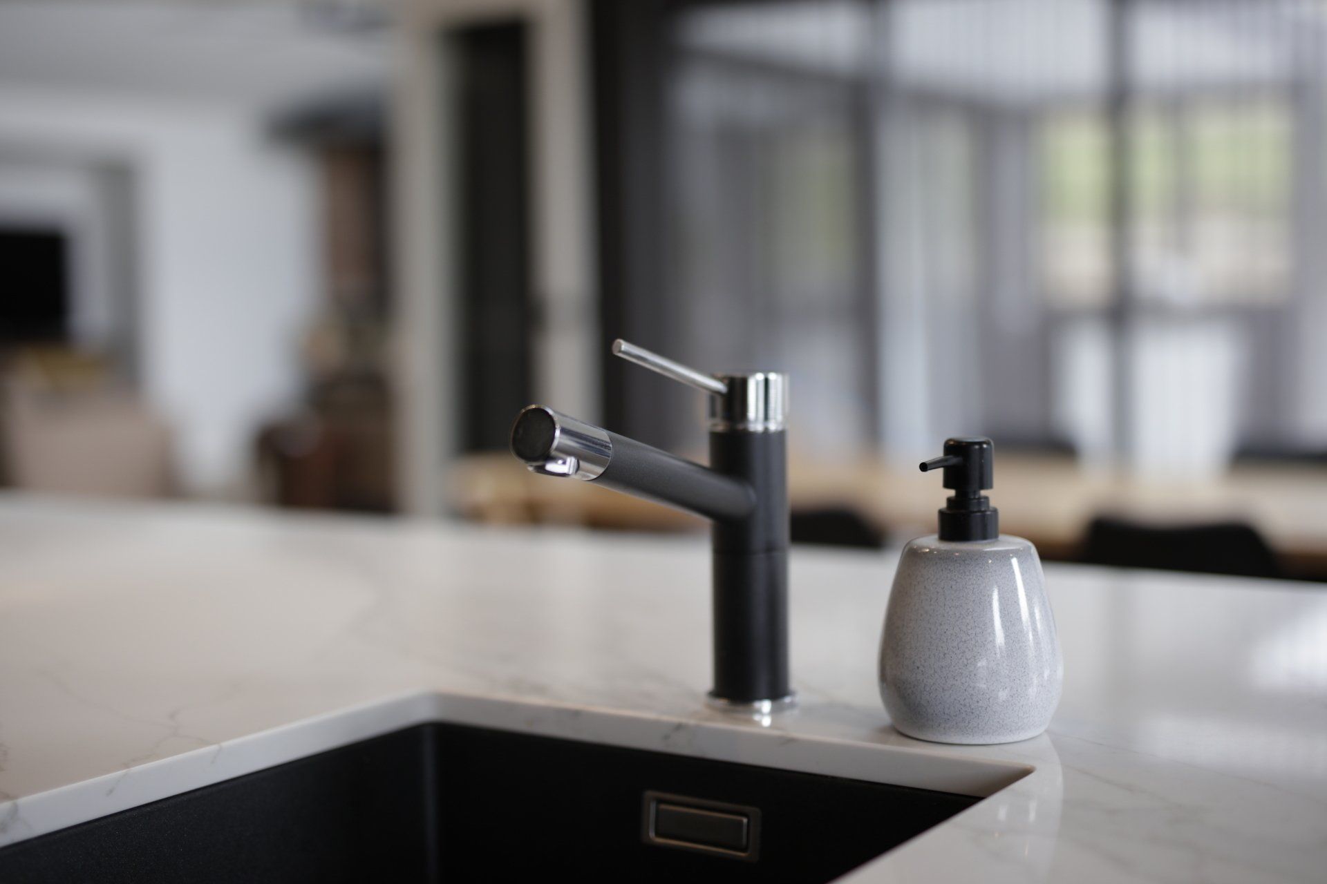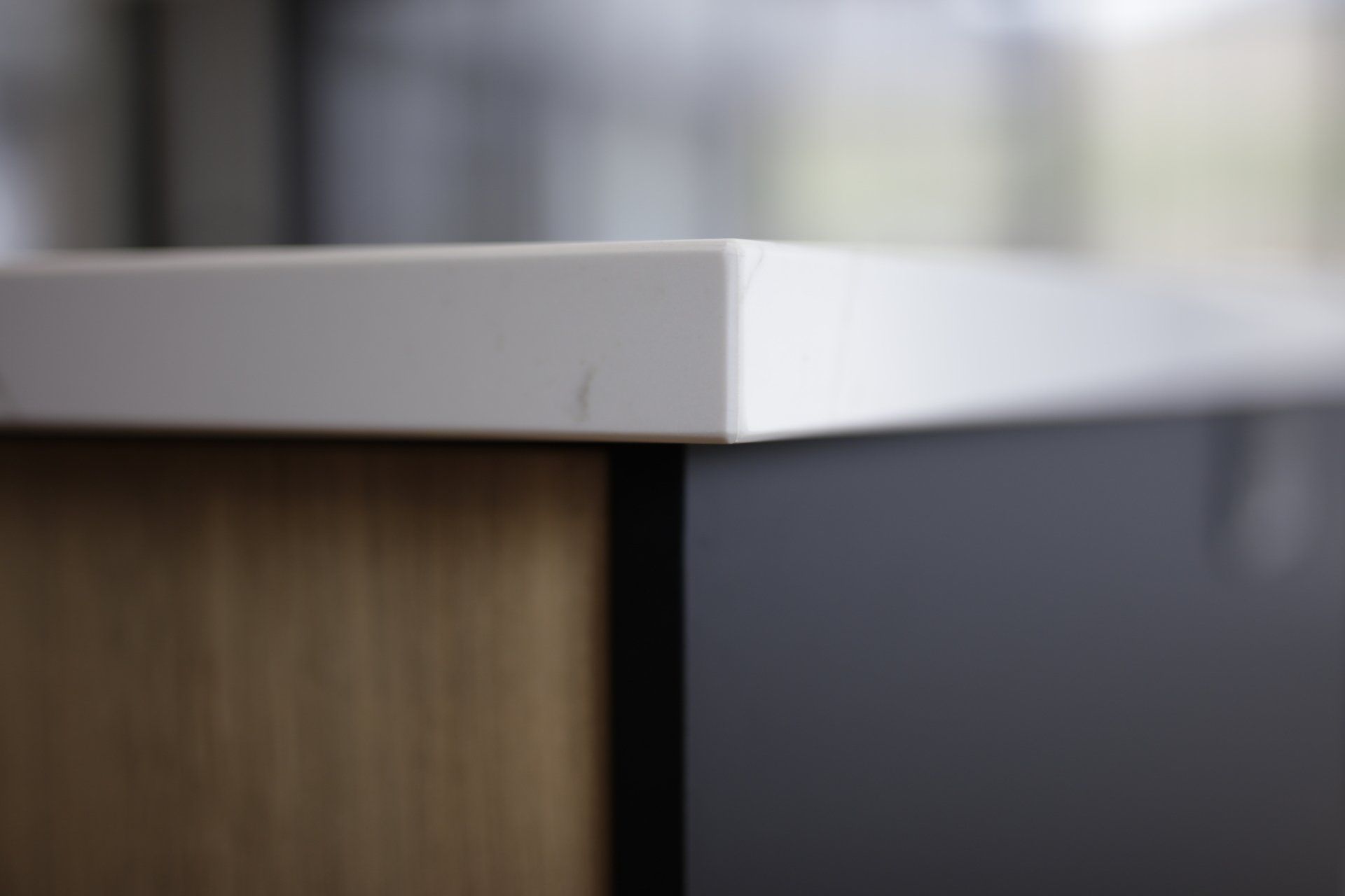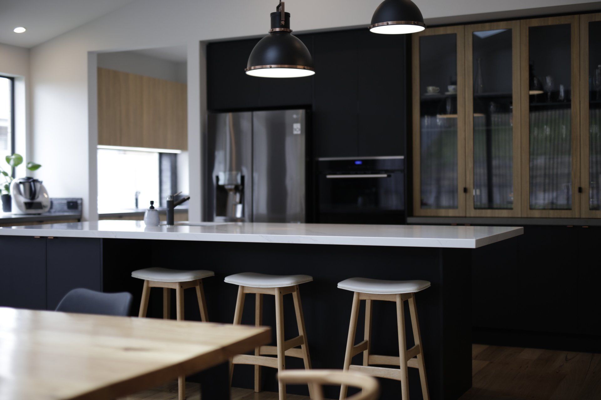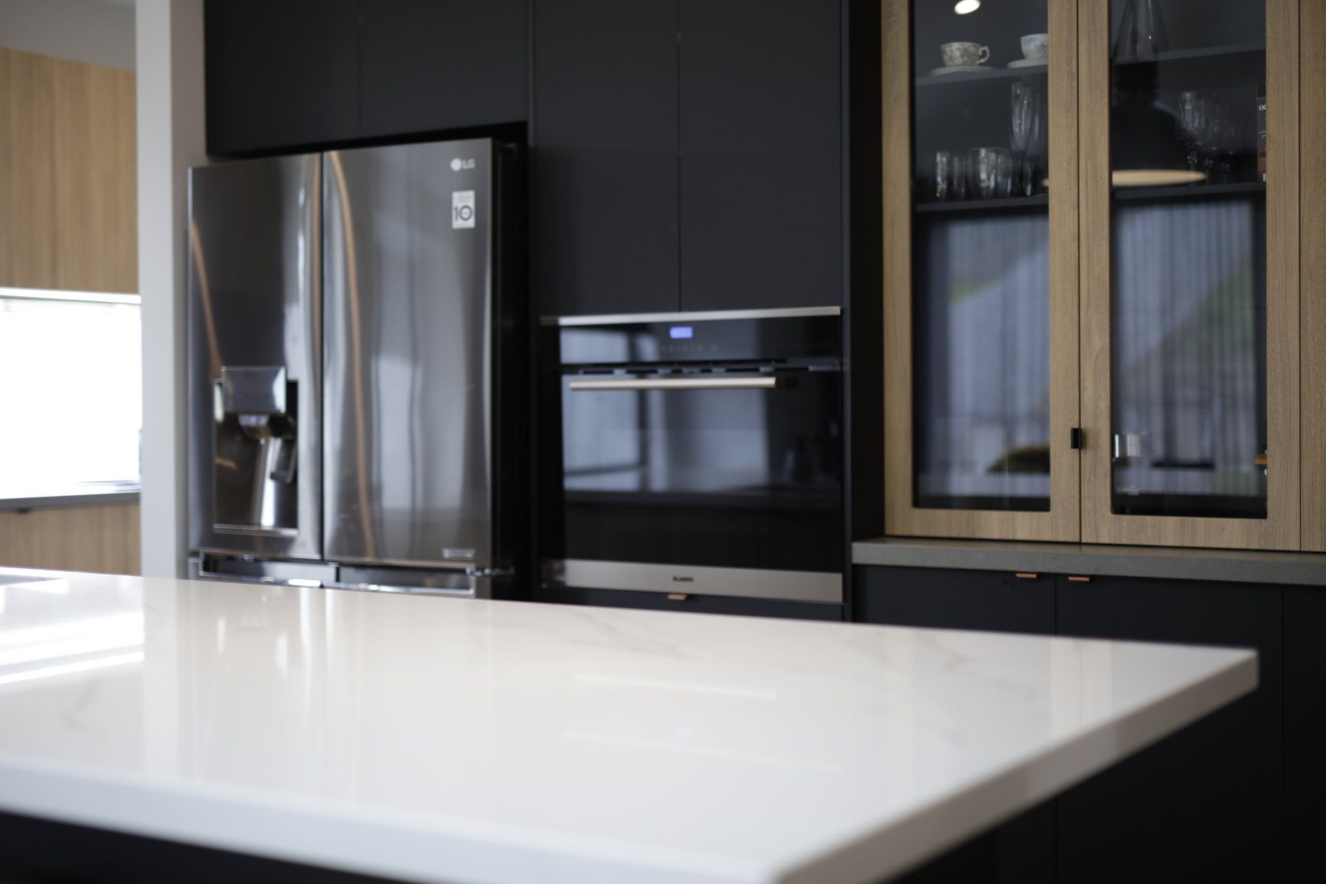 Workspaces are creatively defined by contrasting benchtops and cabinetry colours, adding major drama, differentiating the kitchen zones in this open floor plan, adding sophistication and warmth to the space.
