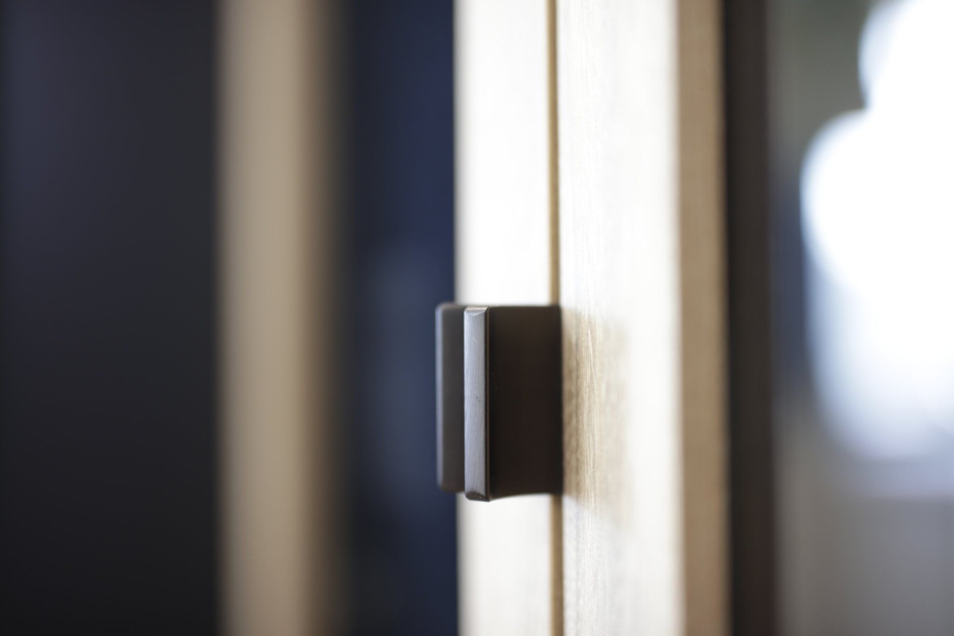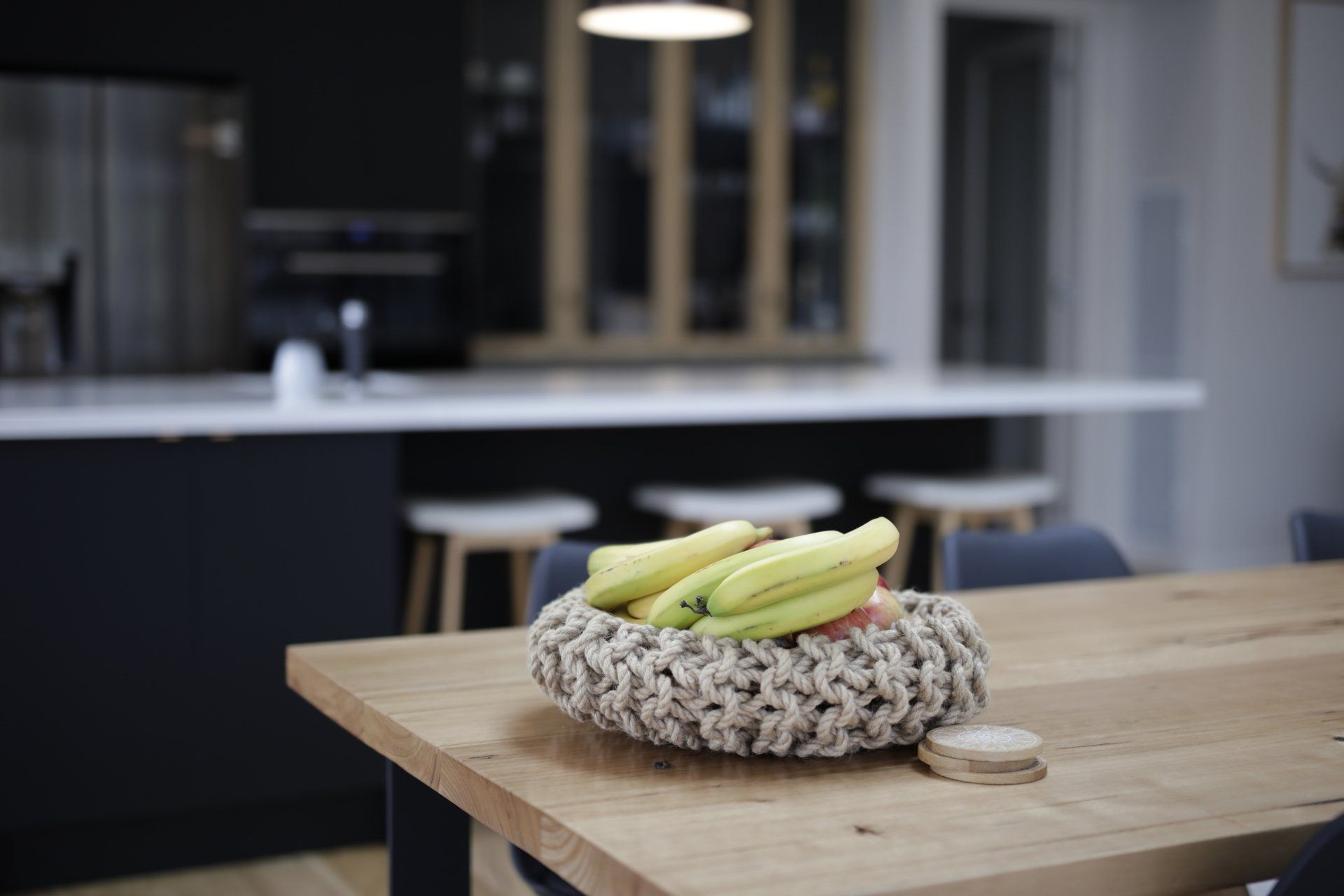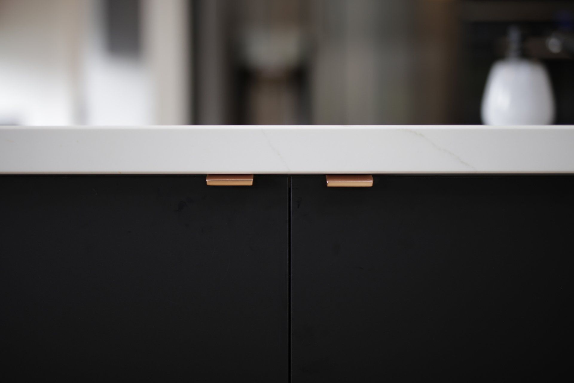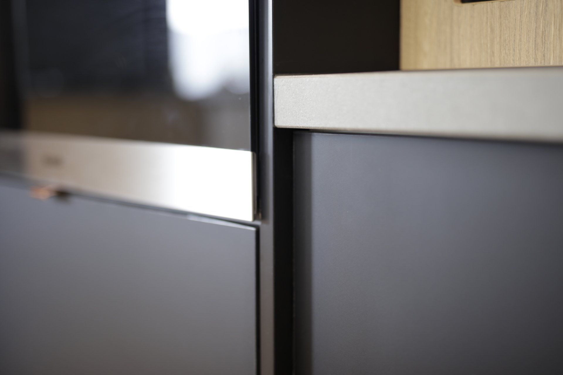 The dark black style feels bold and contemporary, highlighted by the floor-to-ceiling black accent wall, in Haymes Chimney Ash, which adds personality. A challenge to overcome was ensuring ample natural light when working with a dark palette. Here, the large skylight funnels sunlight into the kitchen to stop the space feeling closed in and oppressive. The high slanted ceiling makes the kitchen feel big and bright, turning the ceiling into a unique feature. In addition, the wooden cabinetry section adds a light and warm aspect to the room, holding up delicate houseplant greenery. Further, the copper pull handles against the traceless Matt Black cabinetry and distinct black pull handles against the timber grain cabinetry adds contrast that draws the eyes into the purposeful details of the intermixed design.
