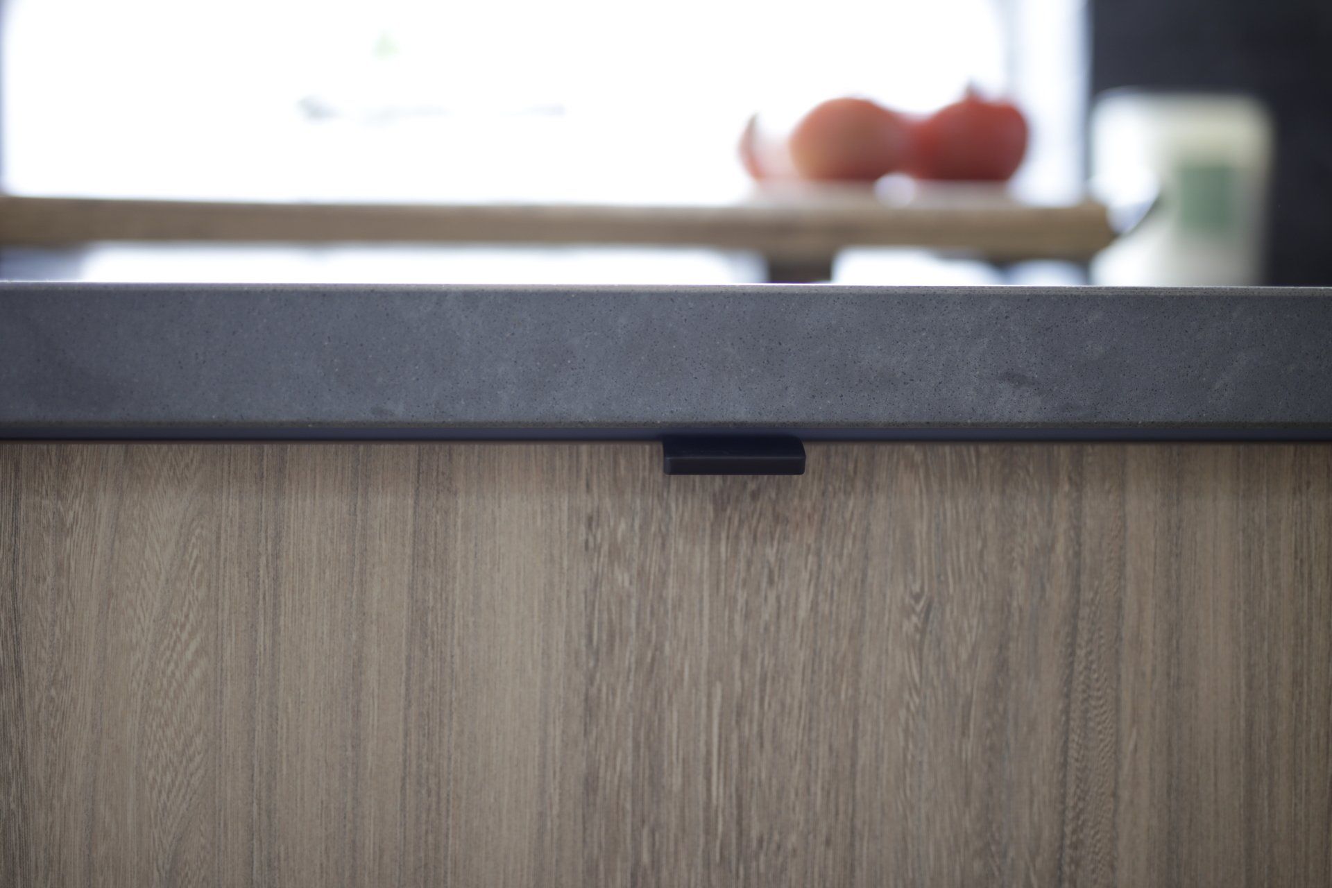 The kitchen’s timber grain Honey Elm laminate cabinets are a pleasant contrast and meticulously blended throughout the sophisticated traceless Matt Black ‘Noir’ palette, while the raw concrete elements and factory style lighting add an industrial tone.