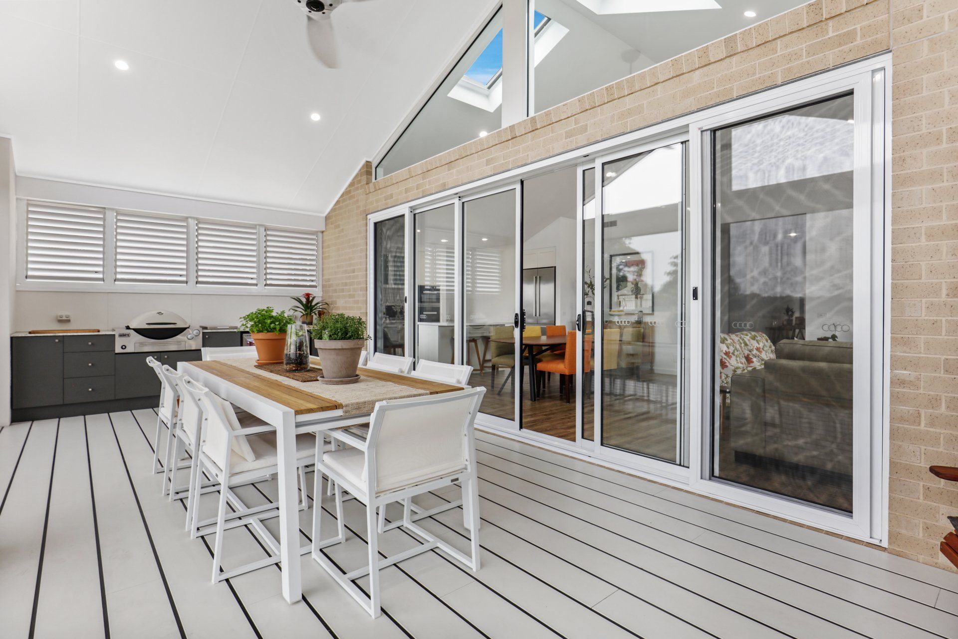 What would a coastal home be without a well appointed outdoor entertaining area? This outdoor patio features in-built cabinetry made with weather resistant compact laminate and a stone benchtop. Custom designed to fit the Weber Family Q3600 barbecue, a wok burner and underbench drinks fridge, there’s no need to go out – or even in! – when you can sit on a protected deck waiting for the lamb to cook, drinking your favourite Saturday afternoon beverage.