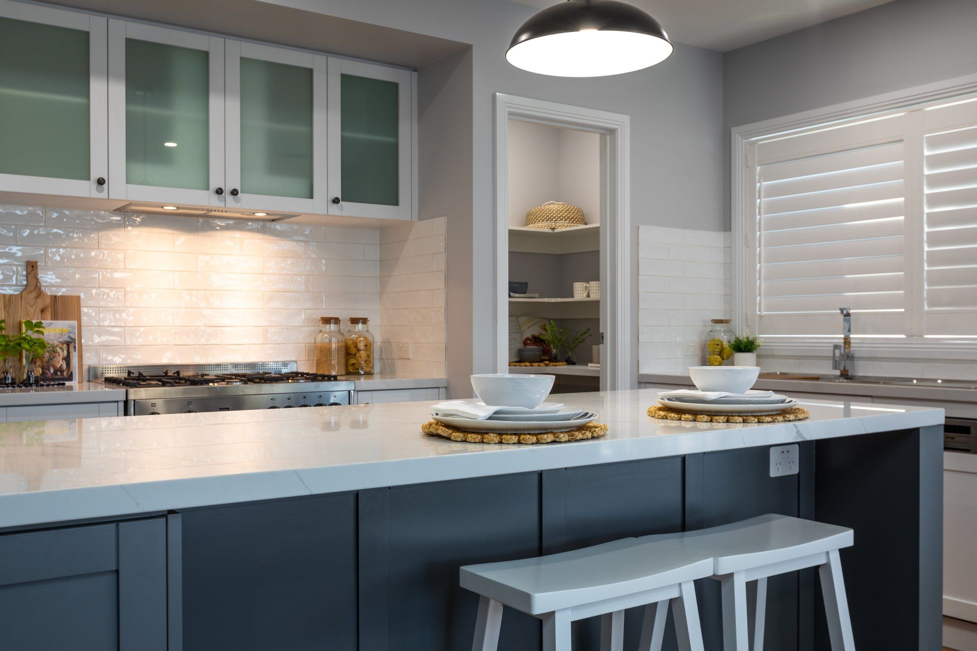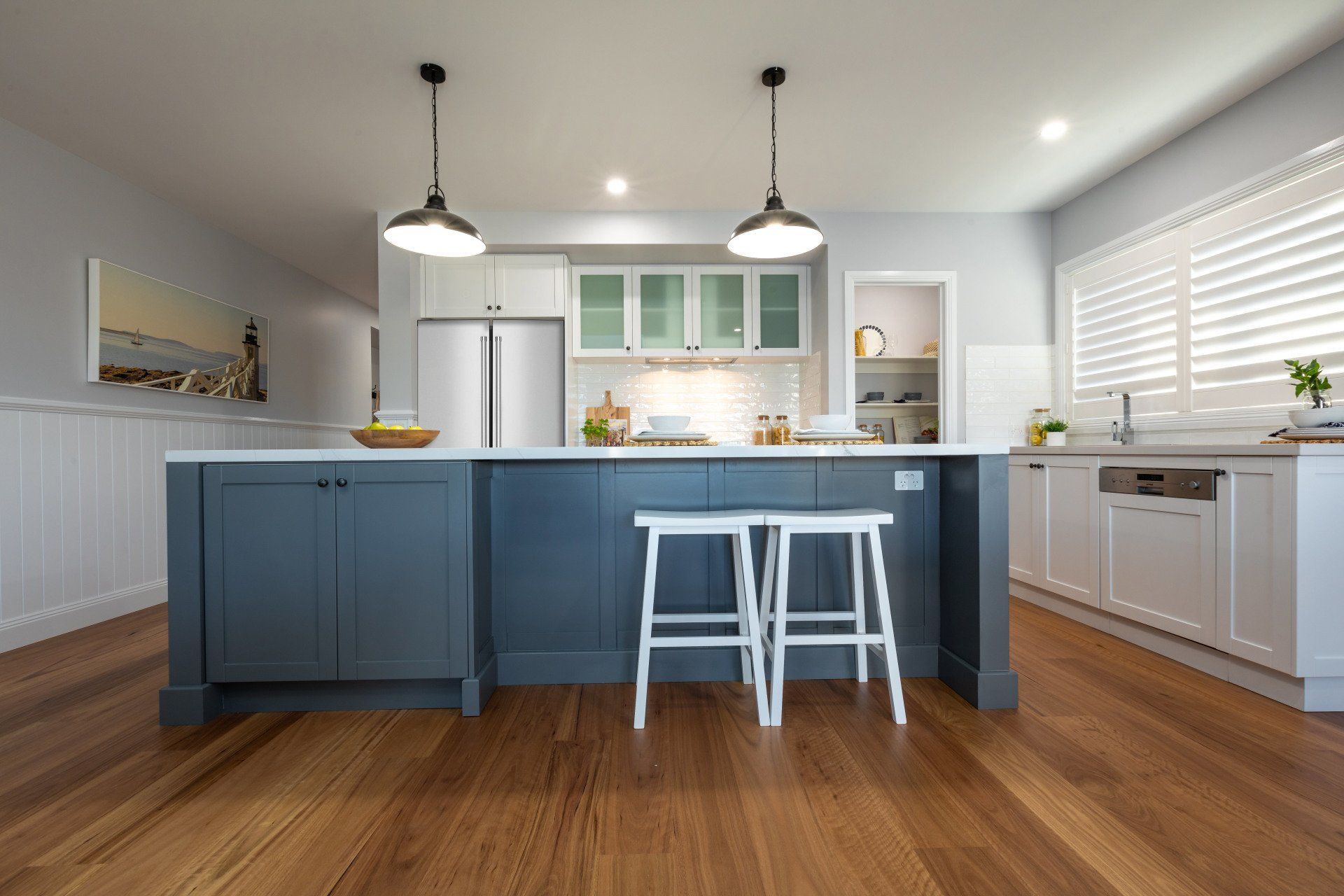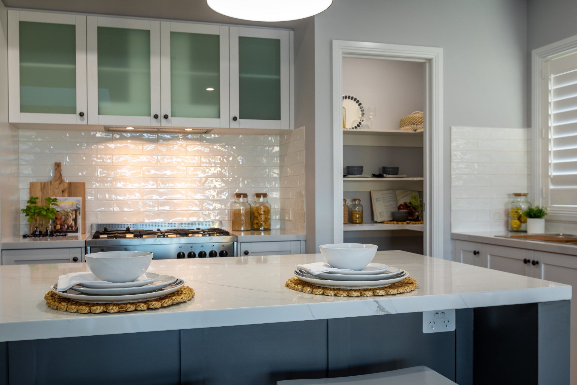 We worked with the builder to create a display home that was sure to impress potential buyers. To capture the refined yet casual lifestyle of the area we created a Coastal Hamptons themed kitchen featuring Essastone Unique Calacatta benchtops and 2 Pac Shaker profile doors in a matt finish with soft close drawers and doors. The kitchen is accented by contrasting island with feature grey-blue coloured base cupboards and frosted glass overhead cupboards which not only adds storage but also conceals the undermount rangehood. Tied together by timber flooring, white subway tiles and soft grey walls the space conveys a look and feel that would make any potential buyer feel at home.