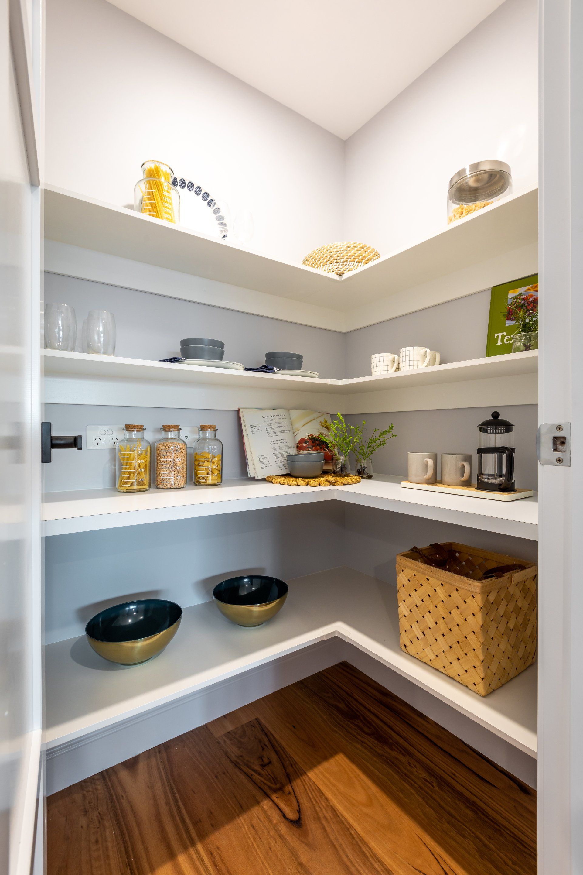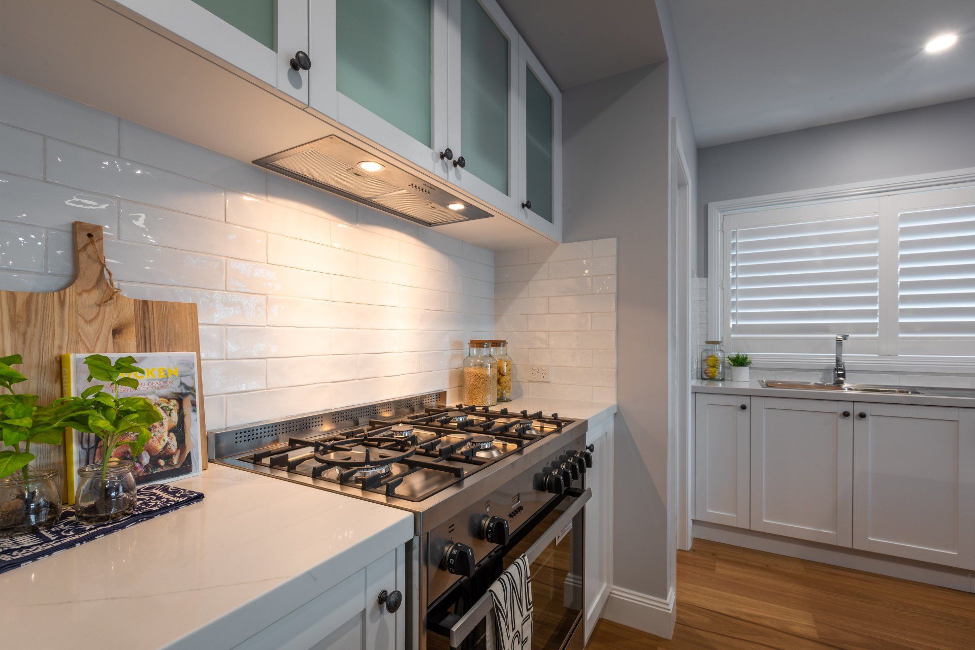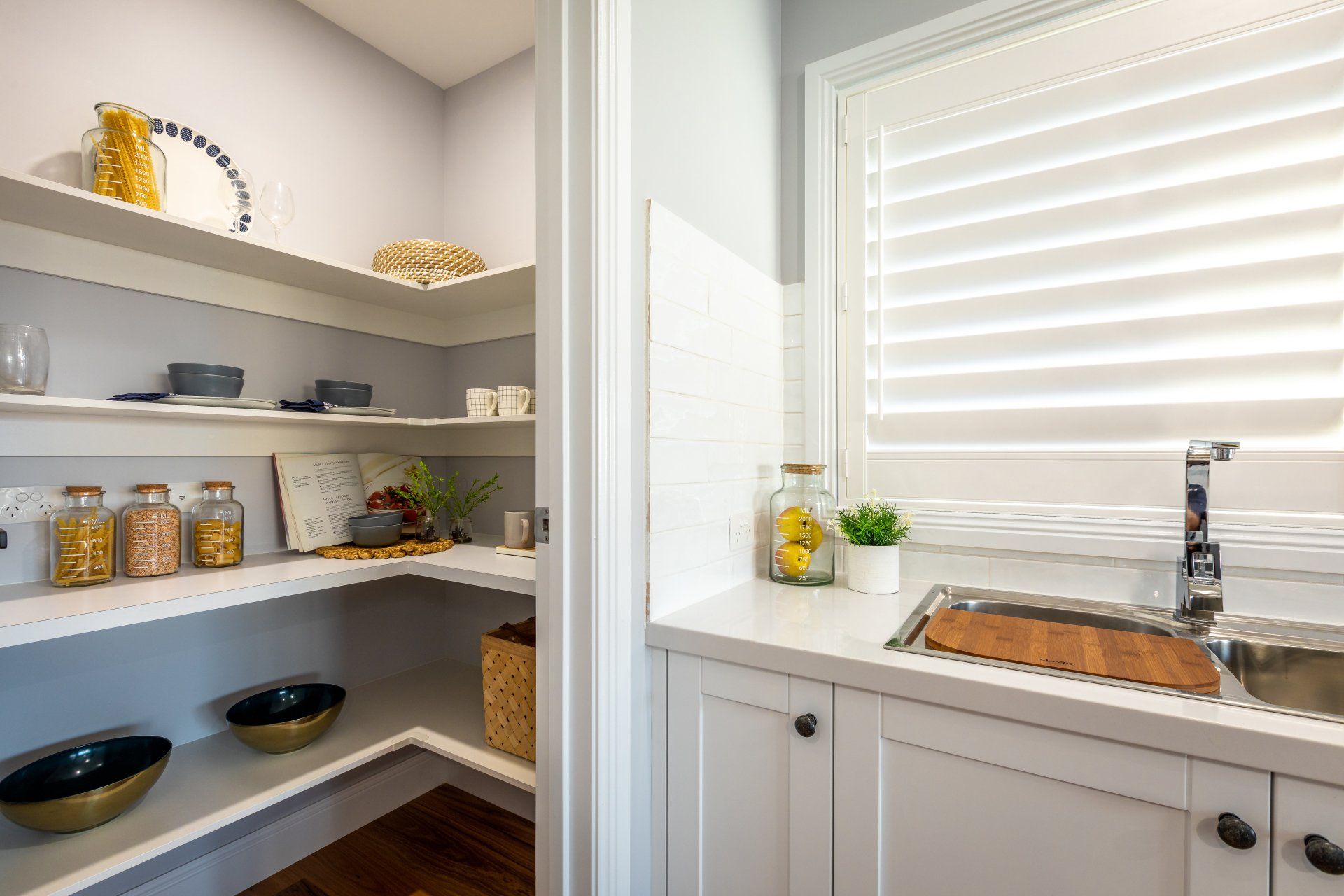 We worked with the builder to create a display home that was sure to impress potential buyers. To capture the refined yet casual lifestyle of the area we created a Coastal Hamptons themed kitchen featuring Essastone Unique Calacatta benchtops and 2 Pac Shaker profile doors in a matt finish with soft close drawers and doors. The kitchen is accented by contrasting island with feature grey-blue coloured base cupboards and frosted glass overhead cupboards which not only adds storage but also conceals the undermount rangehood. Tied together by timber flooring, white subway tiles and soft grey walls the space conveys a look and feel that would make any potential buyer feel at home.