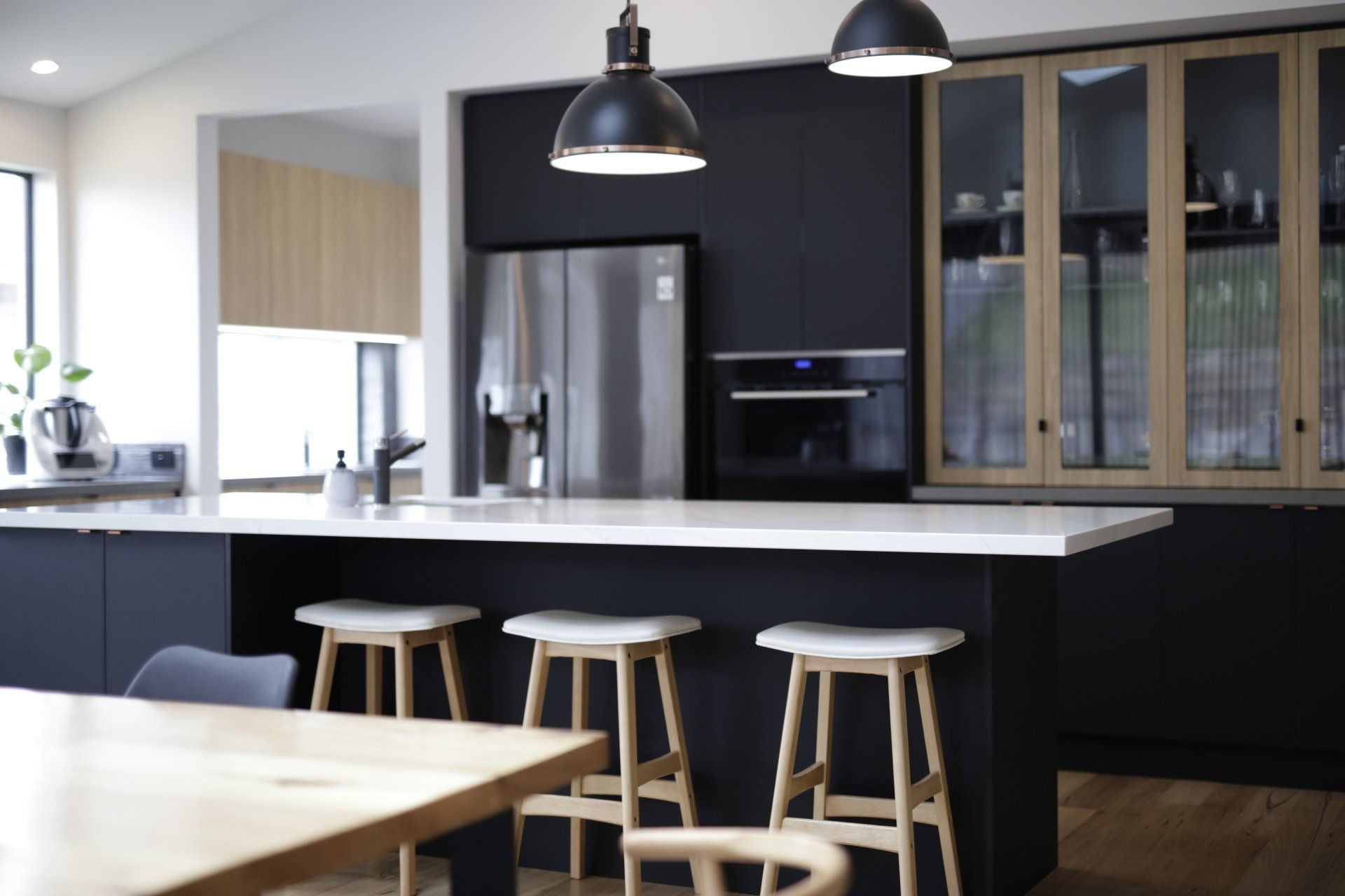 This expansive industrial style home is nestled next to the Inverloch surf beach and features an entertainer's kitchen with a generous butler's pantry and coordinating bathrooms and laundry. The central hub of the home is the kitchen island with white stone benchtop and a mix of traceless black matt and timber grain laminate cupboards. Designed with intention, the addition of seating to both sides means the host is not left standing the whole night. The island is flanked by the cooking area and butler's pantry with feature grey tile backsplash on one side and food storage with glass door bifold pantry to the other, both finished to integrate seamlessly with each other and the surrounding living areas. The styling is carried through to the bathrooms with timber-grain laminate cupboards and feature grey tiles whilst the laundry is more subdued. Matt black fixtures and fittings feature throughout.