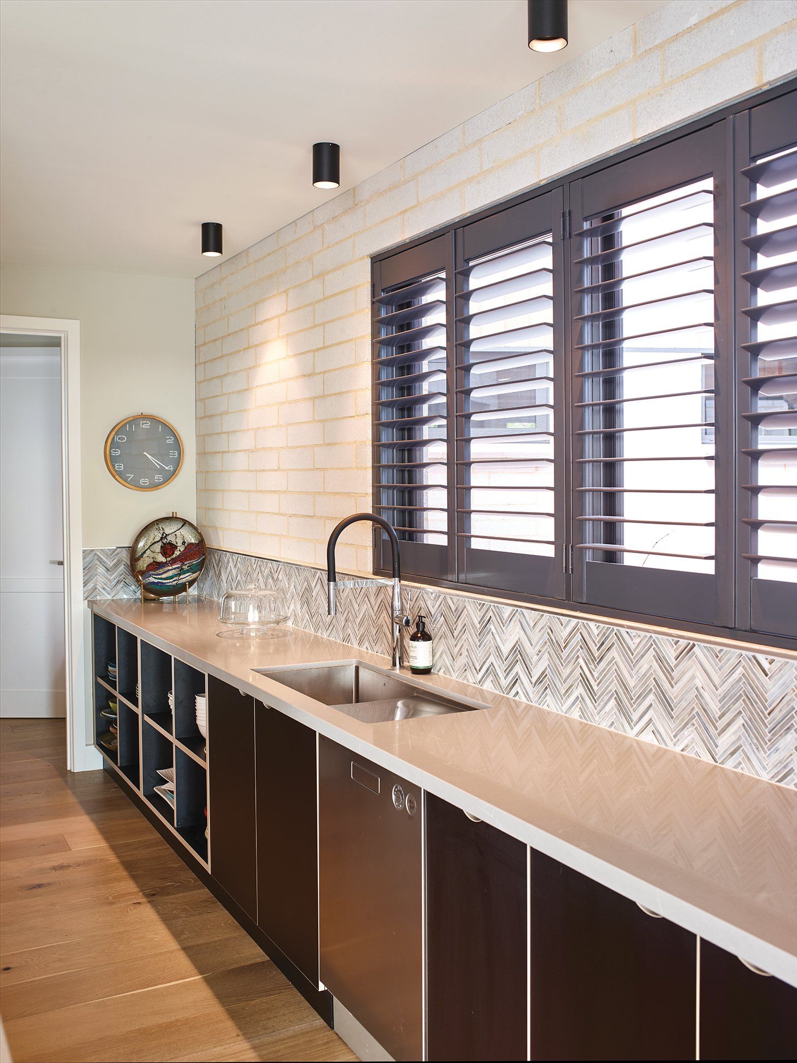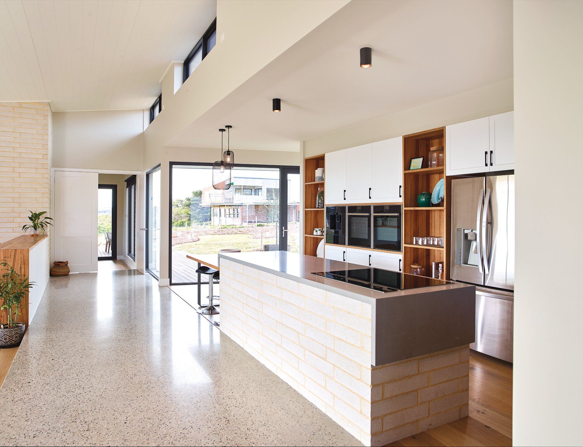 We worked with the home-owners on this modern home perched on Inverloch’s Townsend Bluff to take full advantage of the expansive views of the inlet and agricultural landscape beyond. A large kitchen and butler’s kitchen in the centre is flanked by the glass-walled living areas with custom entertainment and shelving units. Custom joinery was meticulously designed throughout the interconnecting wings for the family’s primary living, sleeping, bathing and working spaces. A variety of timbers and colours derived from natural stone were used in the home creating a connection to the environment around them.